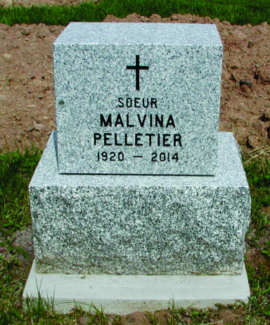 Suite à une longue maladie, à la Maison-mère des Religieuses Notre-Dame-du-Sacré-Cœur de Moncton, le mercredi 5 novembre 2014, est décédée Sœur Malvina Pelletier (Marie-de-l’Eucharistie), n.d.s.c. Elle avait 94 ans, dont 77 ans de vie religieuse. Née le 3 novembre 1920 à Lac Baker, elle était la fille de feu Salime et Virginia (Long) Pelletier.