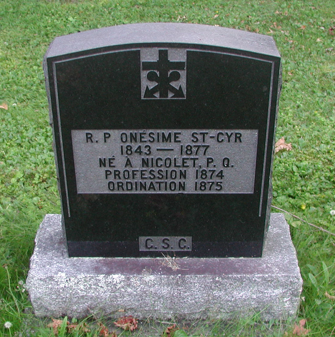 Ce vingt et un mars mil huit cent soixante et dix sept, nous prêtre soussigné, avons inhumé dans le caveau de l’église de cette paroisse, vis-à-vis l’autel de la Ste Vierge, le corps de Onésime St Cyr, prêtre et religieux de la congrégation de Ste Croix, et professeur de rhétorique au Collège St Joseph de Memramcook décédé le dix neuf courant, fête de St Joseph, âgé de trente quatre ans, après deux ans de profession religieuse et dix neuf mois de sacerdoce.