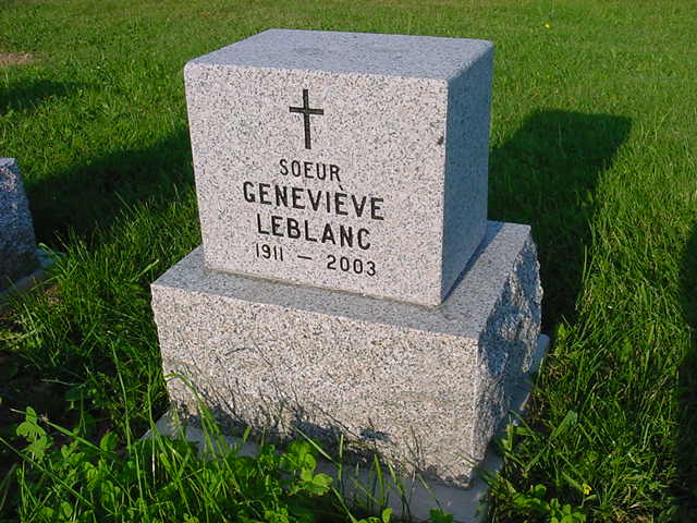 À l'Hôpital régional Dr-Georges-L.-Dumont de Moncton, le dimanche 24 août 2003, à l'âge de 92 ans, est décédée Soeur Geneviève LeBlanc, ndsc (Marie-Hermine), domiciliée à Moncton, à la maison mère des Religieuses Notre-Dame-du-Sacré-Coeur.