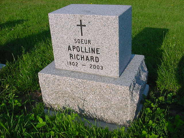 À la maison-mère des religieuses Notre-Dame-du-Sacré-Coeur, le mardi 2 septembre 2003, à l'âge de 100 ans, est décédée Soeur Apolline Richard, n.d.s.c. (Marie-Jeanne-Françoise), domiciliée à la maison-mère à Moncton.