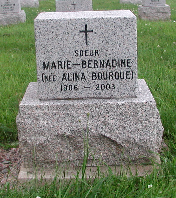 À la Maison-mère des Religieuses Notre-Dame-du-Sacré-Coeur de Moncton, le vendredi 7 novembre 2003, à l'âge de 97 ans, est décédée Soeur Marie-Bernadine, n.d.s.c. (Alina Bourque) domiciliée à la maison-mère, rue King à Moncton.