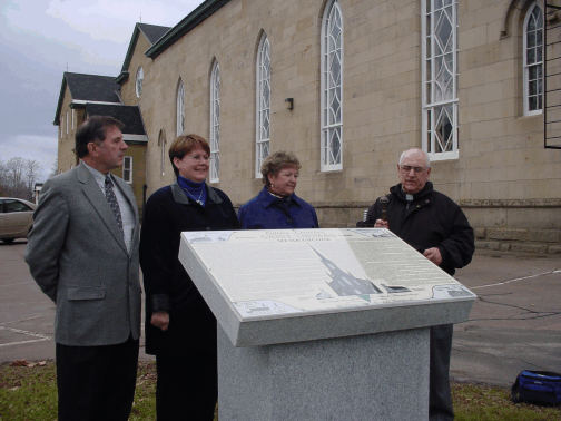 De gauche à droite : Gérard LeBlanc, président, comité de l'Écomusée; Denise Léger-Collin, présidente de la Société; Hermance LeBlanc, maire du Village de Memramcook; Normand Drisdelle, curé de la paroisse St-Thomas de Memramcook