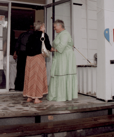 Notre présidente Denise s'entretient avec M. Maurice Basque du Centre d'Études Acadiennes, responsable du développement des divers panneaux faisant partie de l'exposition.