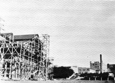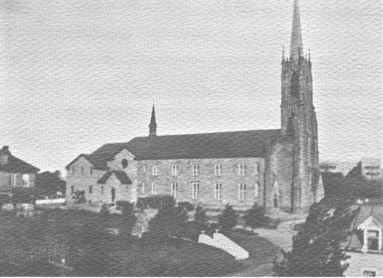 Comme nous l'avons vu précédemment, ces travaux étaient prévus depuis 1896. Le 30 avril 1934, après deux ou trois ans de pourparlers la question fut enfin réglée. Mgr LeBlanc autorise cet agrandissement à l'édifice de 1840, mais avec cette restriction que "la paroisse devrait aider, au prorata de ce qu'ils avaient mis dans la caisse d'agrandissement, les paroissiens de Pré-d'en-Haut à se construire une église qui deviendrait une troisième desserte de Memramcook". Les travaux commencèrent simultanément aux deux églises, et les fondations étaient déjà très avancées quant finit le second terme du Père Dismas LeBlanc, en juillet 1934. Remarquez dans la photo, le collège reconstruit après le feu la même année.  |