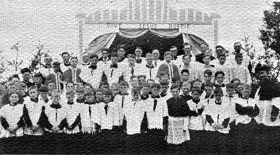 Les servants de Memramcook et de la mission de Lourdes devant le reposoir (probablement en 1931). à gauche, le Père Dismas LeBlanc et à l'extrême droite, le Père Joseph Fiset.  |