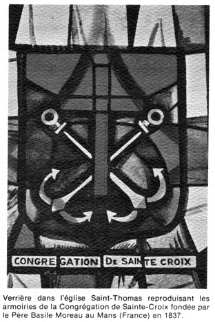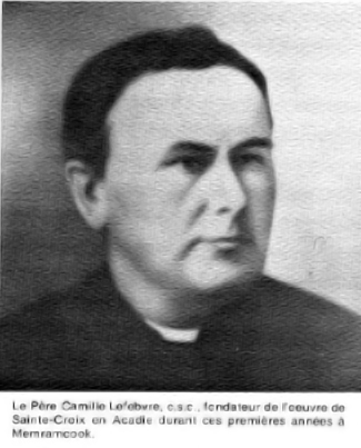 C'est en 1864 que les premiers Pères de Sainte-Croix arrivaient à Memramcook, à la demande de Mgr Sweeney, évêque de Saint-Jean, N.-B. Le Père Camille Lefebvre, avec quelques confrères, venait remplacer l'abbé F -X.-S. Lafrance à la paroisse Saint-Thomas et prendre la relève du collège qu'il avait dû fermer. Le collège se nomma dès lors le Collège Saint-Joseph et il commença à jouer un rôle de leadership dans la formation de professionnels et de commerçants acadiens. Son influence s'exerça d'abord dans l'entourage immédiat, la vallée de Memramcook. Pendant plus de cent ans, il servit de point de ralliement pour les manifestations religieuses et patriotiques. Il offrait à la population locale ce qu'il fallait pour les sports, le théâtre, la musique, etc. En plus de travailler au collège, les religieux de Sainte-Croix se répandirent rapidement dans ce qui est maintenant le diocèse de Moncton, de Bathurst et d'Edmundston. Ils prirent en charge un bon nombre de paroisses entre Sackville et Bouctouche, cédant ces paroisses au clergé diocésain à mesure que le nombre de celui-ci augmentait. Sur ce plan, les Pères de Sainte-Croix, par le potentiel communautaire qu'ils représentaient, ont fait oeuvre missionnaire en milieu paroissial. A la paroisse Saint-Thomas, depuis 1864, plusieurs religieux ont toujours assuré ensemble le service pastoral pour la population de Memramcook et des environs, jusqu'à la division de Lourdes et de Pré-d'en-Haut en paroisses autonomes. Memramcook reste un point de repère pour la communauté, pour ses origines, pour son cimetière communautaire et pour plusieurs religieux natifs de la vallée.  |
