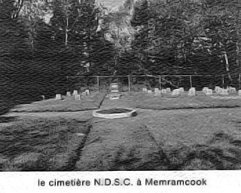 Durant la Guerre 1939-45, cet édifice pouvait desservir deux-cent-cinquante pensionnaires et une soixantaine d'externes. Le rayonnement culturel et religieux atteignit la population féminine francophone des Maritimes et d'une partie du Québec. Ainsi, le Couvent Notre-Dame-du-Sacré-Coeur contribua avec l'Université à rehausser le relief de la paroisse de Memramcook. Ajoutons que l'école du village de Saint-Joseph fut longtemps dirigée par les Soeurs de la Charité et les Religieuses de Notre-Dame-du-Sacré-Coeur. Quelques religieuses sont encore à Saint-Joseph et toutes y ont séjourné au moins pendant leur postulat et leur noviciat. Une randonnée en ces lieux historiques évoque toujours chez nous des liens et fidélité avec le passé et nous fait espérer en l'avenir C'est là que chacune est conduite à son dernier repos. Ce cimetière, providentiellement gardé à l'endroit même de notre fondation, n'est pas pour nous un symbole de mort mais une promesse de vie et de continuité. La Congrégation est faite de celles, qui ont vécu, de celles qui y vivent et de celles qui y vivront. La photo de ces rangées de pierres tombales, c'est pour nous un grand signe d'espérance et un gage de notre profonde amitié avec les bonnes gens de Memramcook.  |