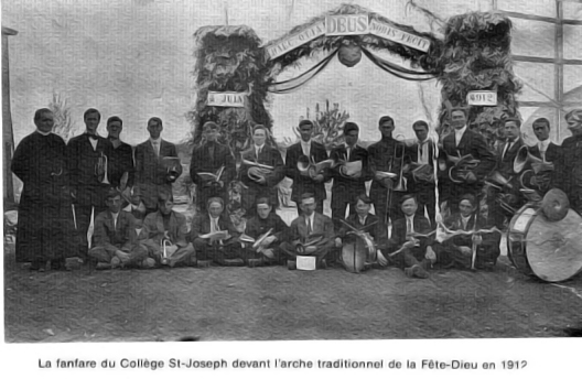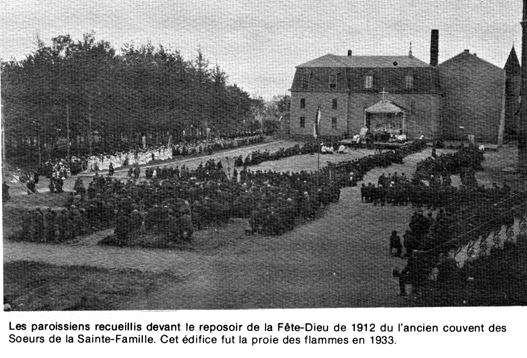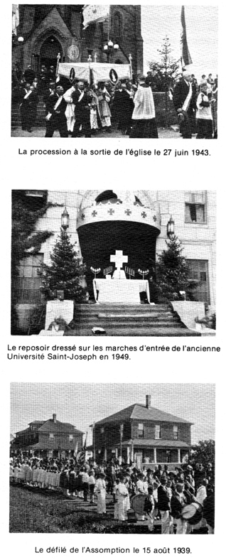 "Dimanche prochain, la messe commencera à huit heures et demie précises. Immédiatement après la grand'messe, on fera la procession solennelle du Saint-Sacrement dehors, si le temps le permet.Celui qui sera marqué pour porter la bannière ira la chercher à la sacristie pendant le dernier Evangile, puis passant par la porte de la sacristie, il se rendra devant la grand porte de l'église; alors les femmes et les filles défileront les premières à la suite de la bannière, ayant soin de marcher en ordre chaque côté du chemin, les premières arrivées se mettront à genoux, et ainsi à la file; pour le retour, elles iront encore à la suite de la bannière, mais dans un ordre contraire pour éviter la confusion, c'est-à-dire que celles qui marchaient devant en allant au reposoir seront derrière en retournant à l'église et vice versa. Les femmes qui auraient dee anfants avec elles ne se tiendront point devant le Saint-Sacrement.